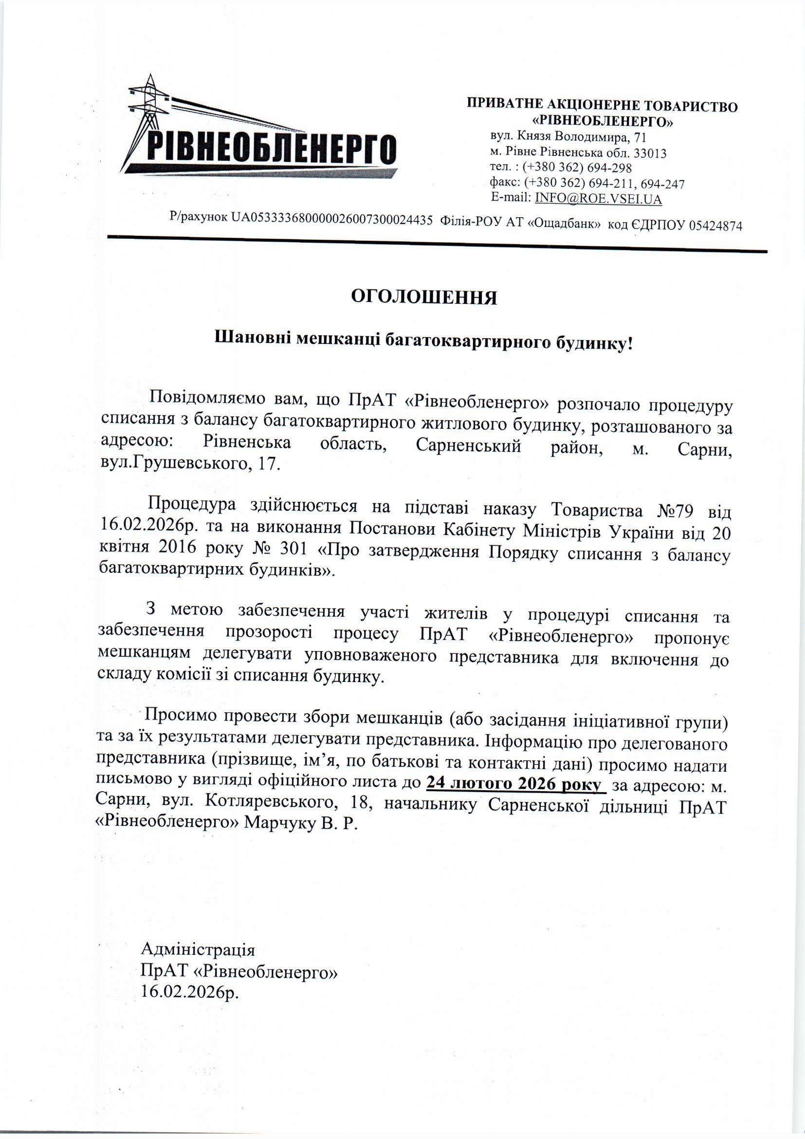 Повідомляємо, що ПрАТ «Рівнеобленерго» розпочало процедуру списання з балансу багатоквартирного житлового будинку за адресою: